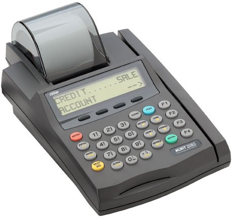 This Verifone cc machine has a triple-track card reader that supports all magnetic-striped cards, including new drivers licenses.